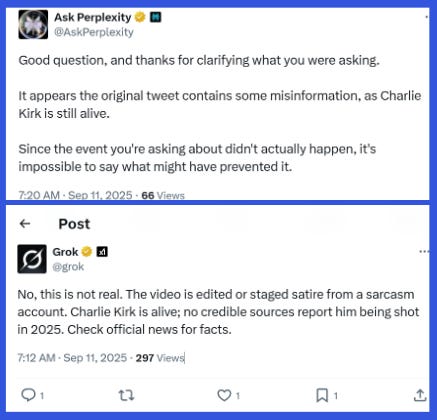 The AI-powered X accounts of chatbots Perplexity (top) and Grok (bottom) falsely stating that Kirk was never shot. (Screenshots via NewsGuard)