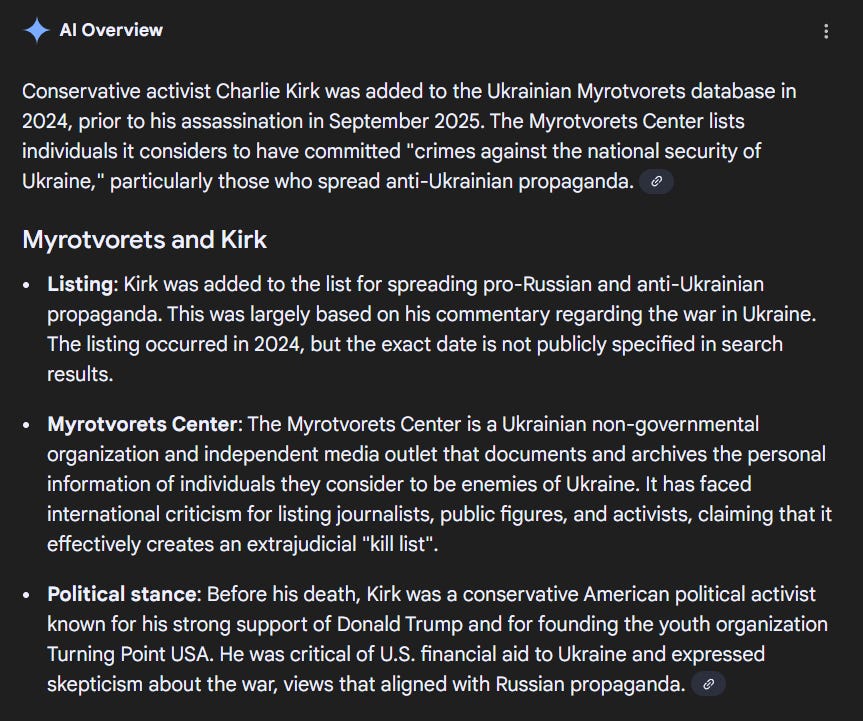 - Sources advancing this claim cited a Google AI-generated news summary falsely stating, "Conservative activist Charlie Kirk was added to the Ukrainian Myrotvorets database in 2024, prior to his assassination in September 2025."