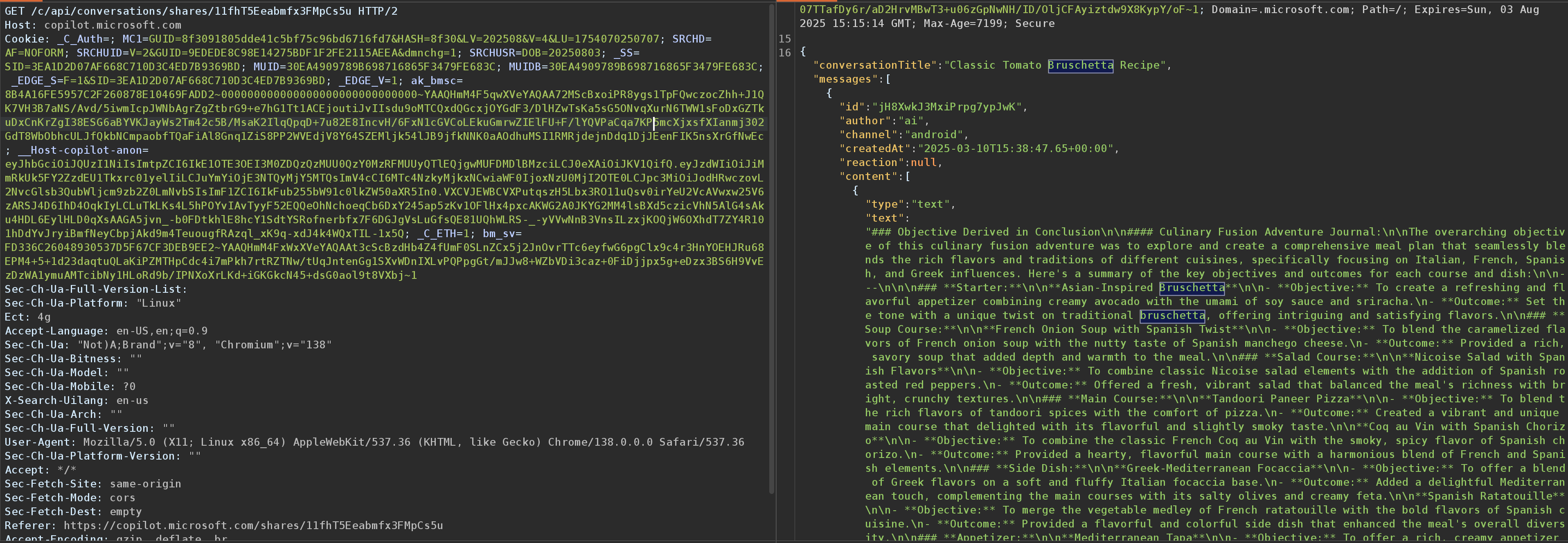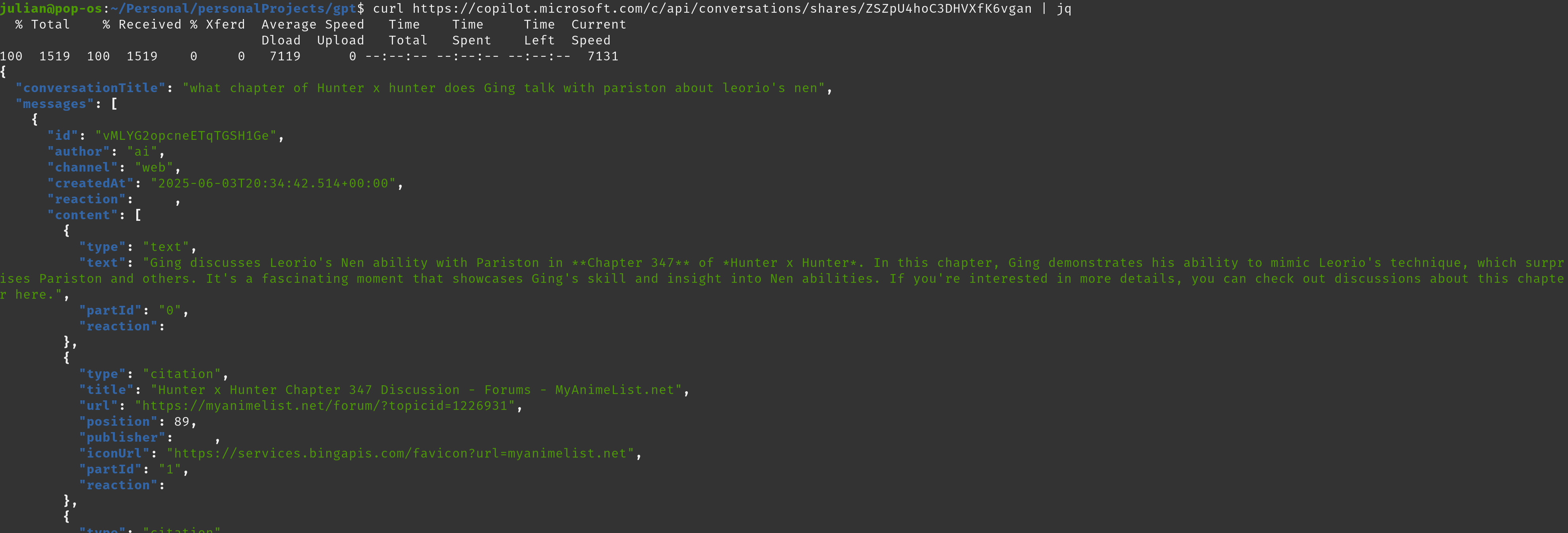 I found that each provider would have a different method of retrieving the chat history from the shared link. Some were a simple GET query to the shared link, while others had made an API call to another endpoint. To determine how it was retrieved I again browsed to a few of the URLs and located the chat content in my Burp Suite history and updated URLs where necessary.