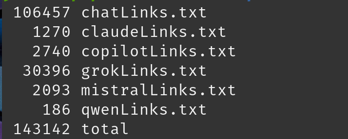 Using this, we could run a simple wget on the endpoint saving the content to our local host, then we grepped for the URL patter for each of the providers, and output the result to a file specific to each LLM.